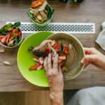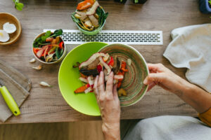 Close up of senior woman putting fruits and vegetable peelings to bowl
